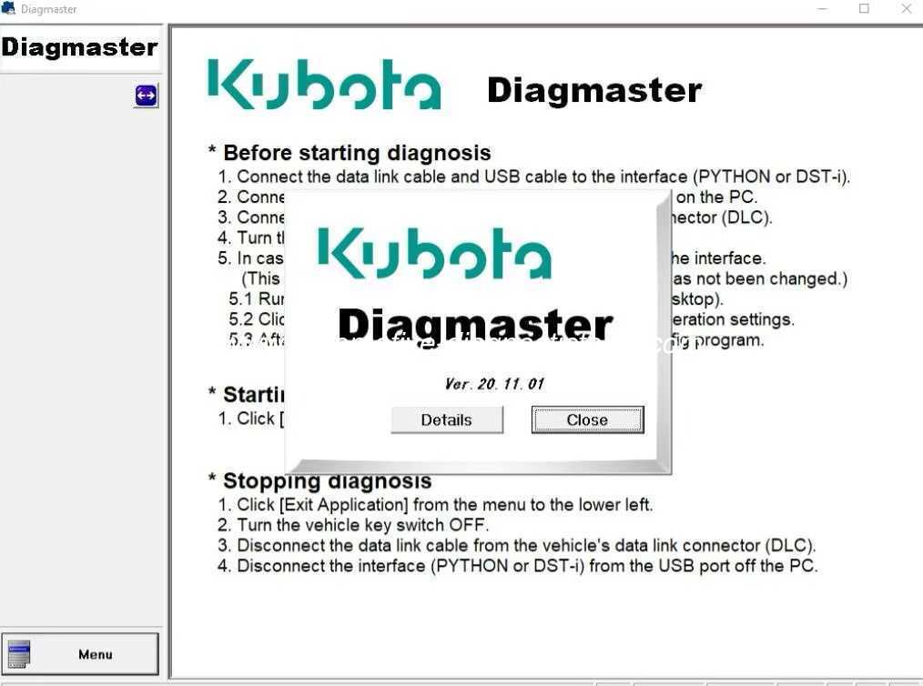 ΔιαγνώστηςΜε νέες δυνατότητες όπως η αυτόματη ανίχνευση οχημάτων, το σύστημα μπορεί να χρησιμοποιεί ένα σύστημα επικοινωνίας που είναι εξοπλισμένο με ηλεκτρονικές συσκευές.Οδηγίες καταγραφής δεδομένων και αντιμετώπισης προβλημάτων, η πλατφόρμα Diagmaster προσφέρει όλες τις διαγνωστικές πληροφορίες που απαιτούνται για την προηγμένη ανάλυση προβλημάτων.Η μοναδική σχεδίαση διευκολύνει την επέκταση και την ενημέρωση για να υποστηρίξει νέα συστήματα διαχείρισης και οχήματα. Το Diagmaster περιλαμβάνει μια βάση δεδομένων Merlo, All, Dieci, Bobcat, Manitou, Nonself, Kubota, Carrier, Takeuchi και CNH, κατέχει επίπεδο 9