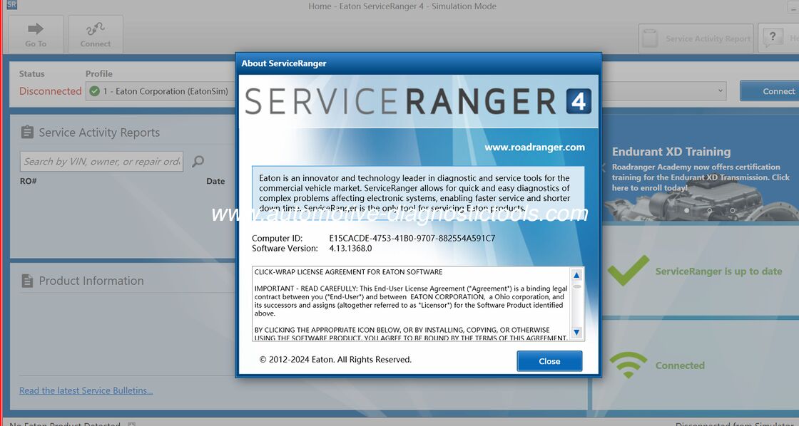 Ο Μάγος σύνδεσης στο 4.13 καθοδηγεί τους χρήστες μέσω μιας σειράς ερωτήσεων σχετικά με το όχημά τους και τον προσαρμογέα επικοινωνίας για να δημιουργήσει αυτόματα ένα προφίλ ρυθμίσεων σύνδεσης.Δείχνει επίσης εάν απαιτείται καλώδιο διασταύρωσης. Στην ουσία, το Eaton ServiceRanger 4.13 είναι ένα ολοκληρωμένο εργαλείο που δίνει τη δυνατότητα στους τεχνικούς να διαγνώσουν, να λύσουν προβλήματα και να εξυπηρετήσουν αποτελεσματικά τις αυτόματες μεταδόσεις του Eaton,με το πρόσθετο όφελος του Μάγιστα σύνδεσης για να απλοποιήσει τη διαδικασία σύνδεσης.